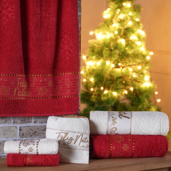 O kit é composto por 5 toalhas, sendo 3 na cor vermelha e 2 na cor pérola, cores clássicas que representam o espírito natalino.