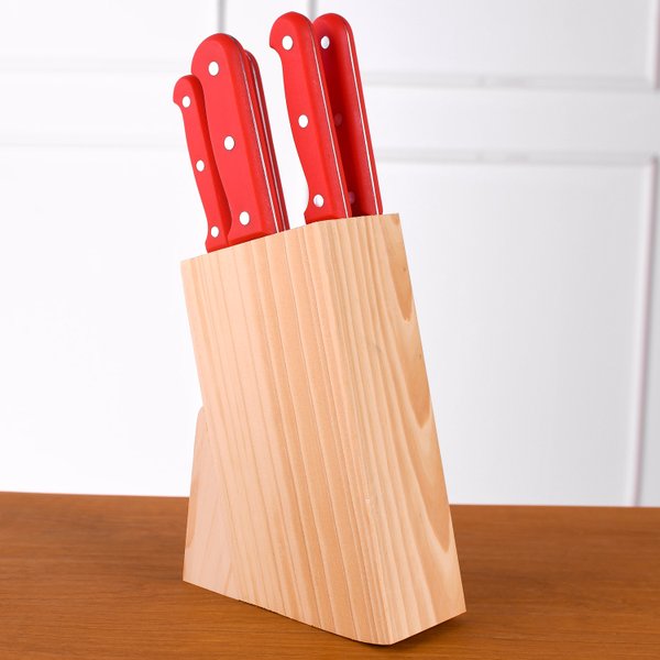 Cepo de Madeira Exclusivo: além de organizar e proteger as facas, o cepo adiciona um toque elegante à bancada, mantendo sua cozinha mais bonita e funcional.